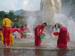 Das wird gefolgt von einem Spiel mit dem Wasser, besonders unter den jüngeren Mitgliedern aus der Gesellschaft. Das kann jeden beinhalten, der dort teilnehmen möchte. Das Wasser ist gedacht, dass es gutes Glück über das neue Jahr und jedermann bringt, der mit dem Wasser begossen wird und die ganze Aktion wird begleitet von Glückwünschen für das neue Jahr.