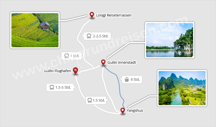 Unsere Guilin-Karten beinhalten eine Karte von Guilin zur geografischen Lage, eine Karte mit den wichtigsten Sehenswürdigkeiten in Guilin sowie eine Karte, die die Verkehrsverbindungen zu den Hauptstädten Chinas zeigt.