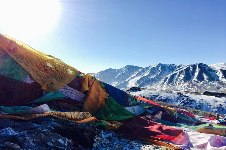 Auf dem Weg über den Gyawula Pass(5180 m) - der Eingang zum Himalaya. Zu unserem Ziel dem Tschomolangma “Mutter des Kosmos” begleiten uns alle Weltklasse-Gipfel: Mt. Lhotse (8516 m), Mt. Tschomolangma (8848 m), Mt. Qowowuyag (8201 m) und Mt. Mayalu (8463 m). Die Achttausender formen sich zu Bergketten, wie silberne Wellen. Es bietet sich bei gutem Wetter der Blick auf den Himalaya.