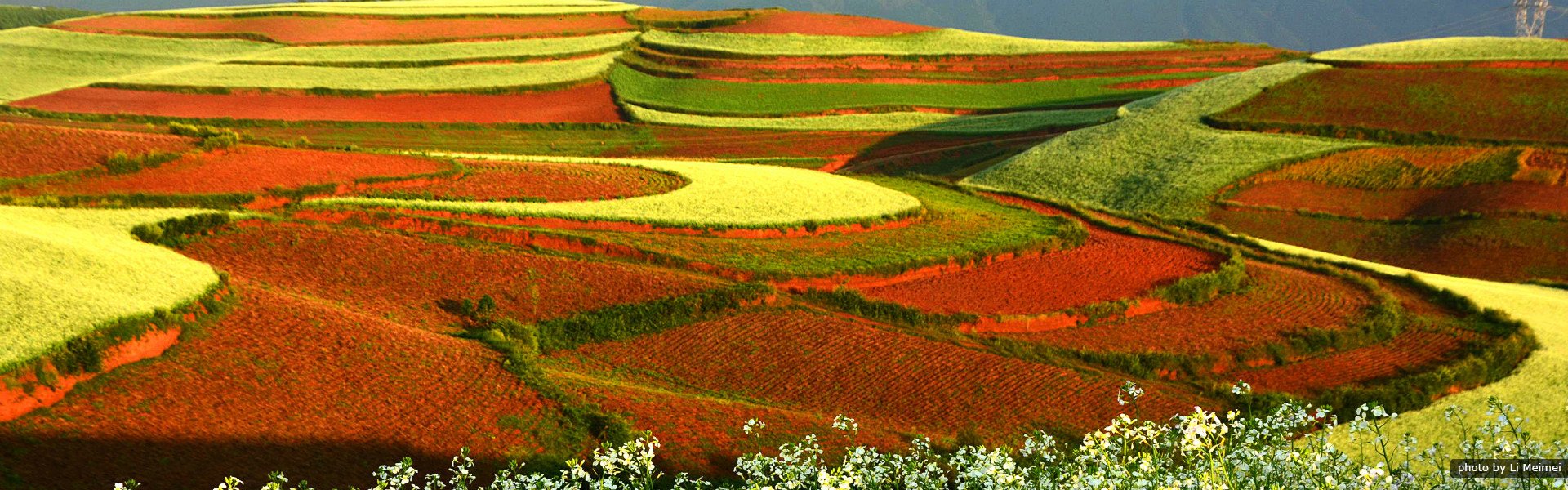 Dongchuan Rotland: Es ist eine typische und charakteristische rote Fläche auf dem Yunnan Plateau. Dunkelrote, lilarote und ziegelrote Farben sind hier entstanden. Die roten Hügel sind von Rapsblumen und Yam Blüten im Frühjahr und goldenen Weizenrollen in Wogen wie ein gelber Fluss in Wellen im Herbst bedeckt. Des halb ist es ein idealer Ort für die Fotografie.