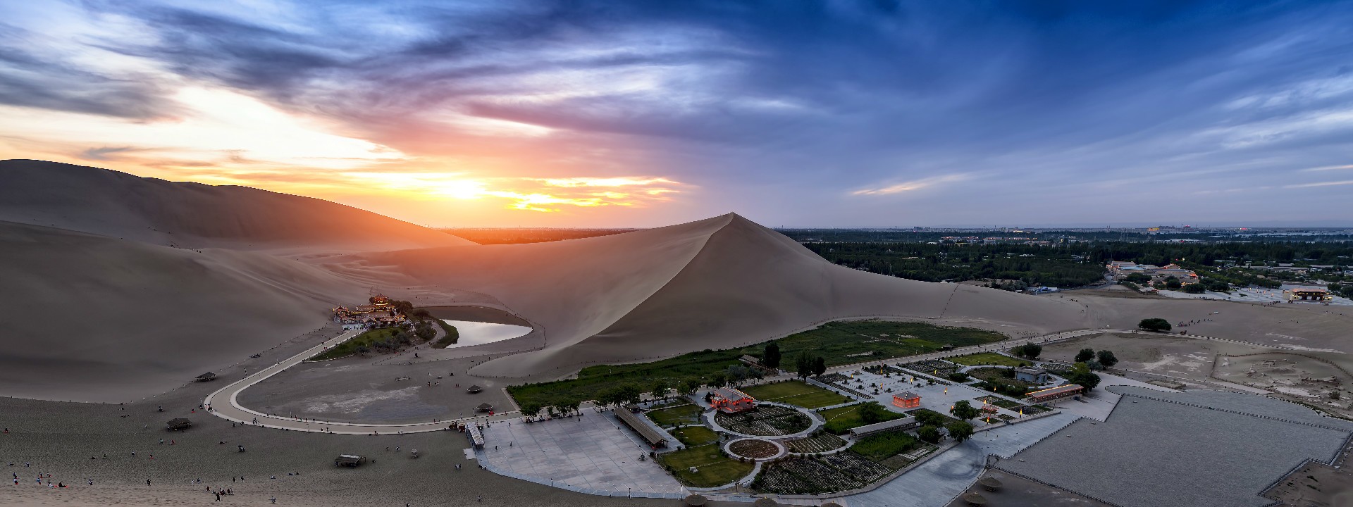 The First Spring under Heaven – die erste Quelle unter dem Himmel liegt sichelförmig am Fuße des Mingsha Berges (Berg des singenden Sandes), die sich beide in die unendlich scheinende Wüste fortsetzen.